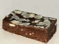 This is a dark chocolate slice which is studded with crispy biscuits and topped with a layer of chocolate icing and a scattering of flaked almonds.